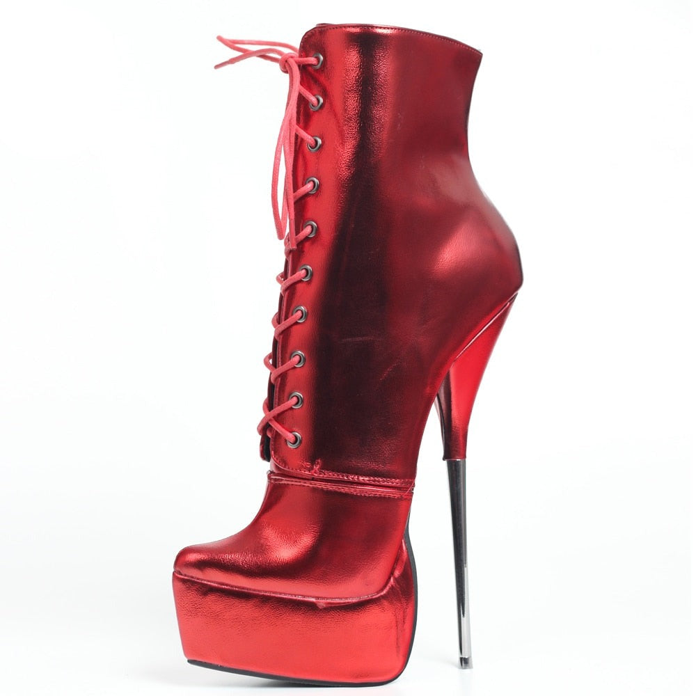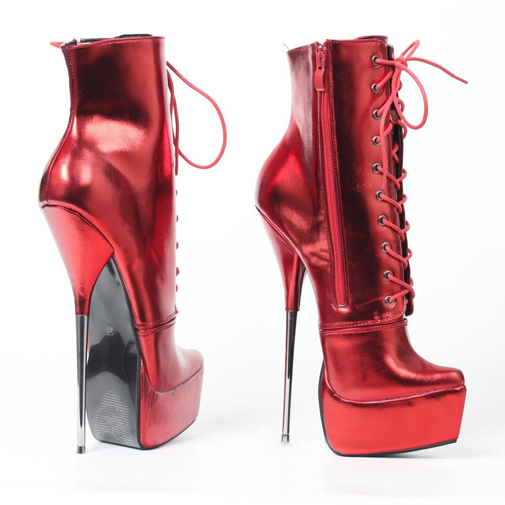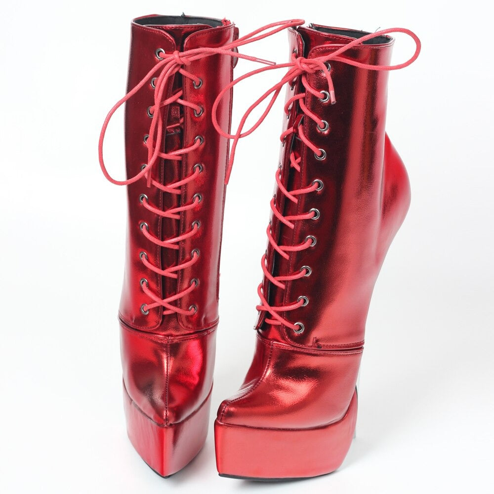 Queens, these iconic red metallic spike-heel ballet boots are the fantasy you didnβt know you needed β until NOW. Featuring a jaw-dropping phallic steel stiletto heel that screams βI am the moment,β these babies turn every step into a full-on performance. Shiny red PU leather that catches every light, lace-up front for that perfect snatched ankle, and a hidden zipper so you can slip in and slay fast. Ankle height, platform base for (slight) mercy, and built to make the crowd gasp when you death-dropβ¦ or just stand there looking expensive.