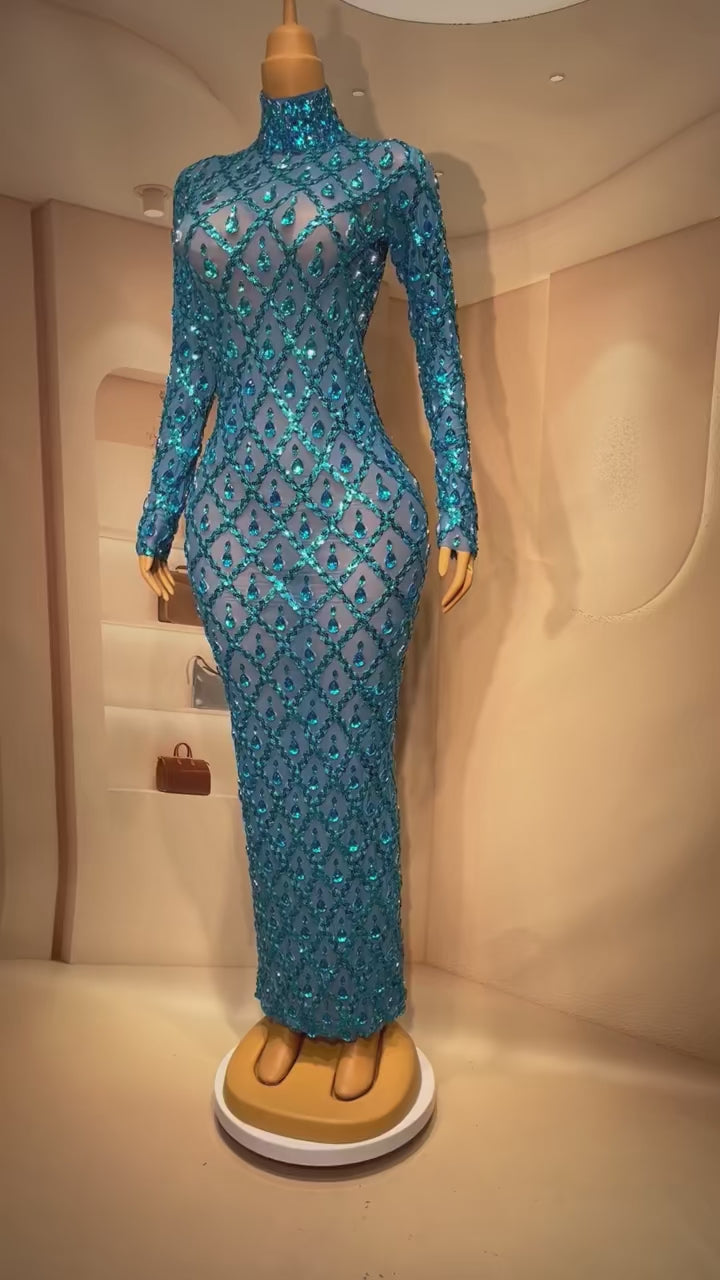 Honey, are you ready to be the undisputed queen of the night? This ain't your grandma's bingo night mesh! This electric blue mesh stunner shimmers brighter than your wit with cascades of shimmering sequins strategically placed to snatch every single spotlight (and maybe a few wigs) in the room.