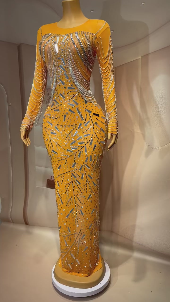 Honey, are you ready to be the citrus dream of every judge's panel? This Mic Drop Mesh dress is a shimmering symphony of tangerine terror and chrome captivity. A cascade of fiery orange rhinestones dances across the sheer mesh body, leaving nothing but envious gasps in its wake. Silver chains slither down your curves, whispering promises of backstage compliments and first-place trophies.