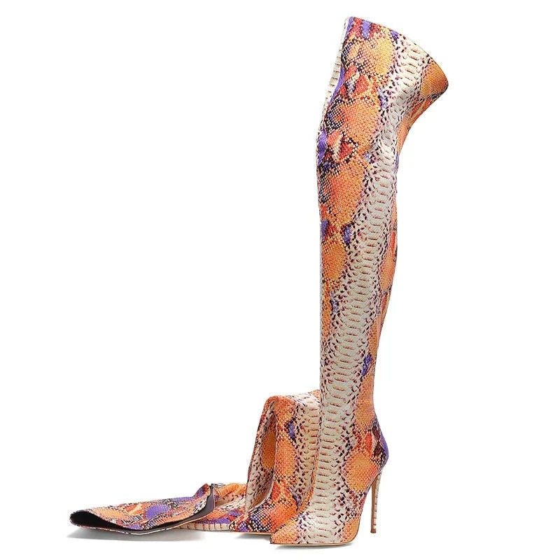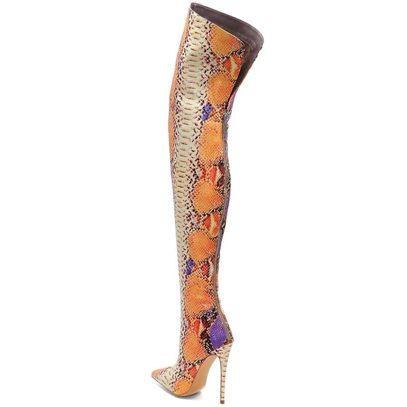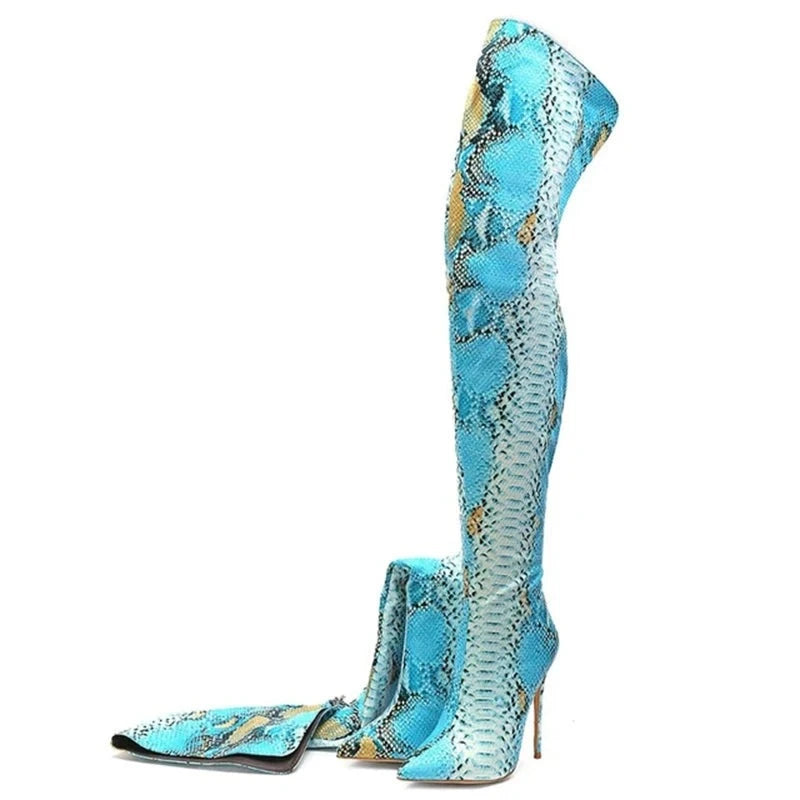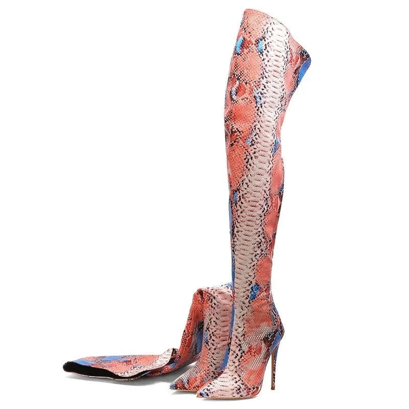 Unleash your inner diva with our Snakeskin Drag Thigh High Boots, the ultimate statement piece for every drag queen. Crafted with a bold, serpentine pattern and a sleek, glossy finish, these boots are designed to turn heads and break hearts. The towering stiletto heel and thigh-high silhouette accentuate your legs, giving you an irresistible edge on stage. Perfect for performances, photoshoots, or just strutting your stuff, these boots offer a blend of fierce style and uncompromising comfort. Step into the spotlight and own the night with our Snakeskin Drag Thigh High Boots – because you deserve to slay every step of the way.