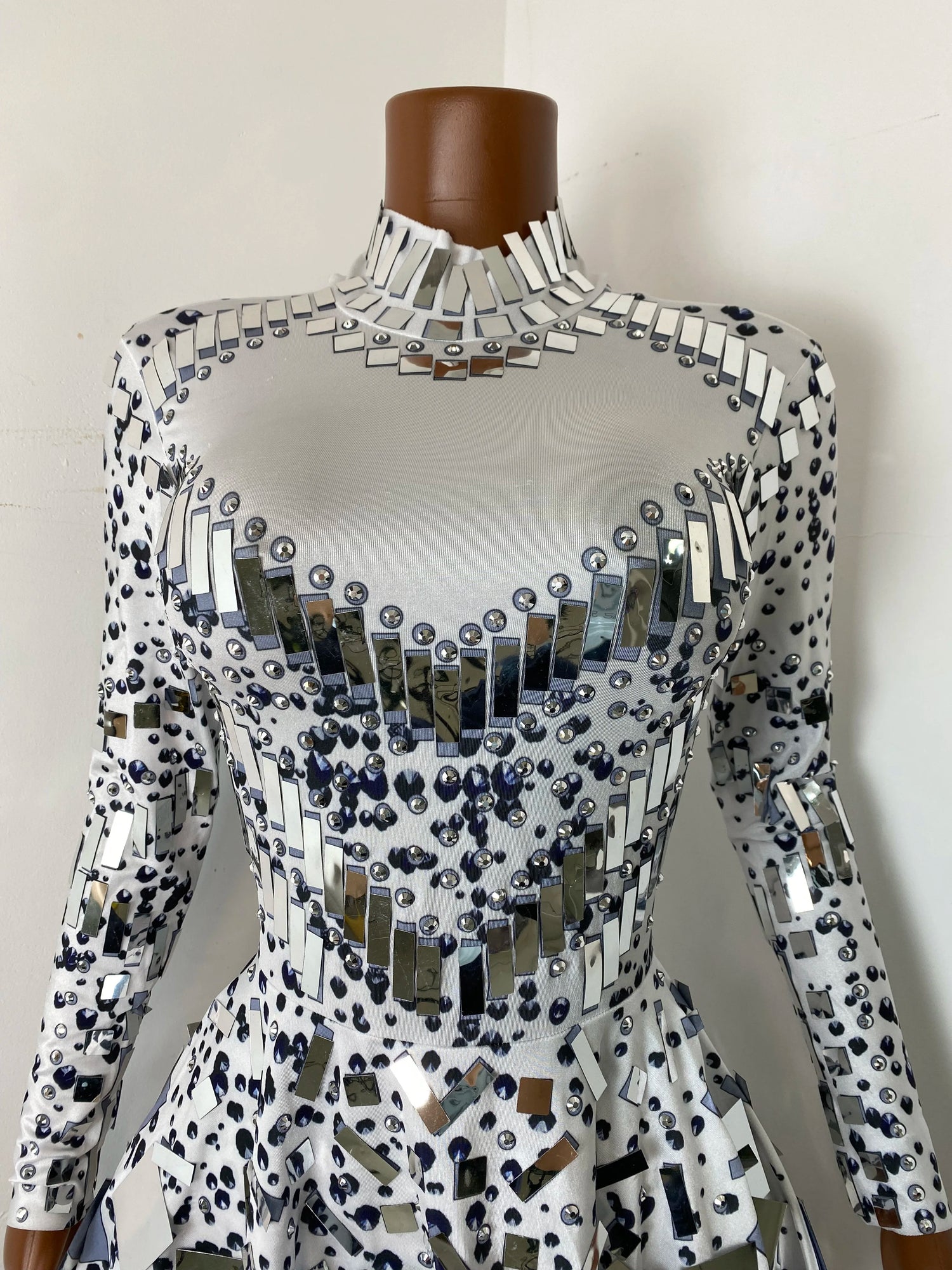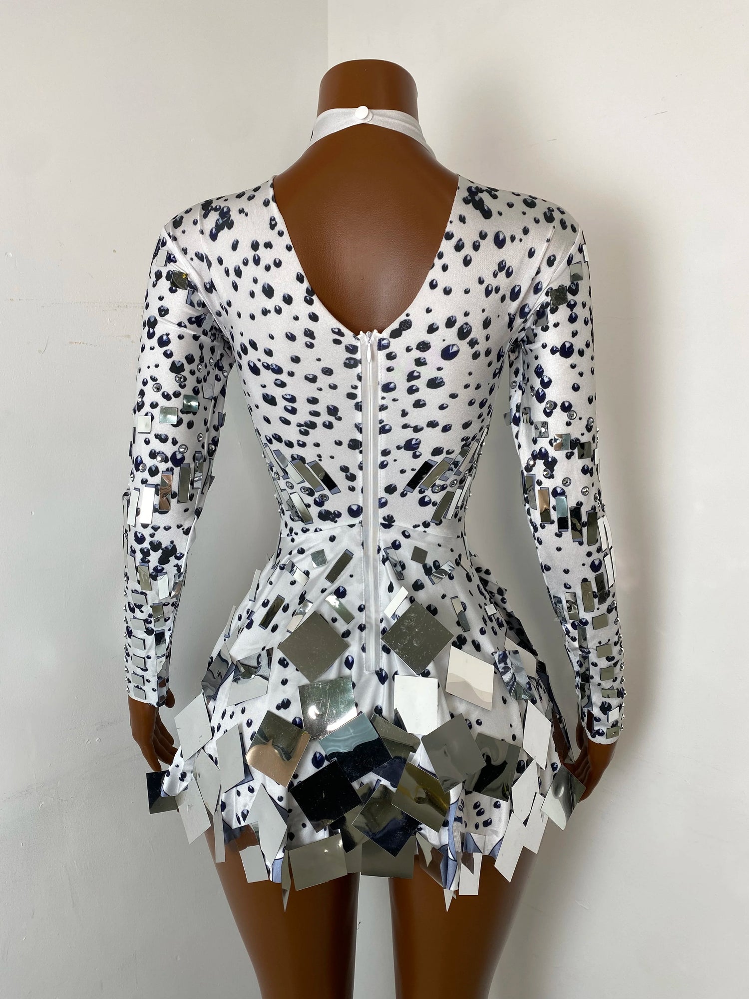 Slay the runway and own the stage, queens! This show-stopping mirror shard bodysuit dress is your ultimate weapon for fierce drag performances, club nights, or any occasion where you need to sparkle like the superstar you are. Crafted with a hypnotic mix of shimmering silver mirror pieces, crystal rhinestones, and a sleek white base dotted with black spots for that edgy, futuristic vibe, this long-sleeve mini dress hugs your curves, flares at the hips for dramatic movement, and reflects every light in the room—turning you into a walking disco ball. High neck for elegance, form-fitting silhouette to accentuate your tuck and padding, and a peplum skirt that sways with every sashay. Whether you're lip-syncing for your life or posing for the gods, this outfit screams "YAS, QUEEN!" and is built to withstand the heat of the spotlight.