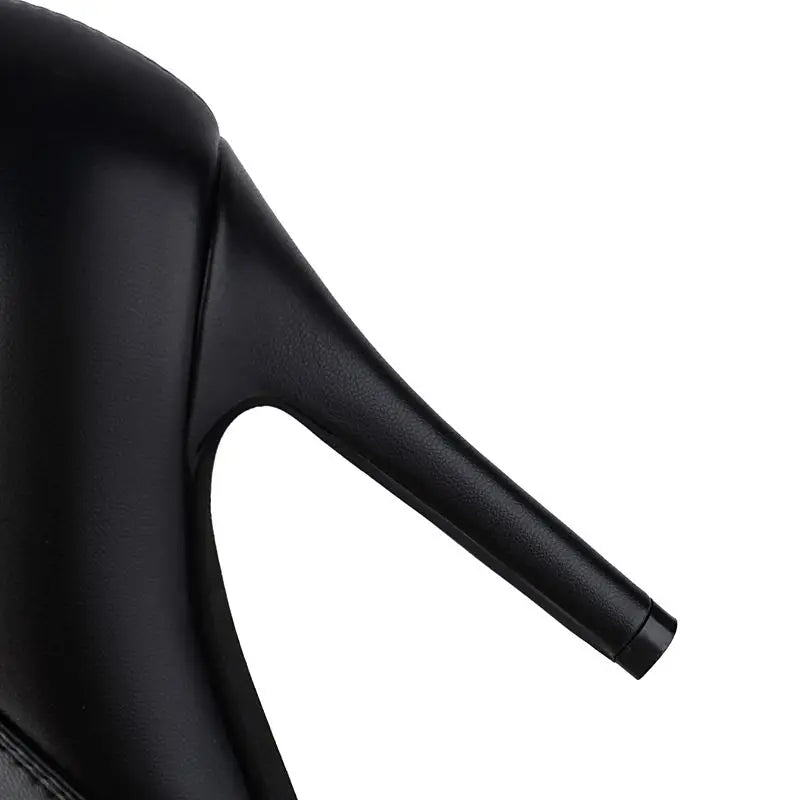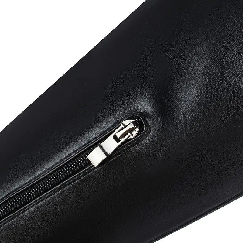 Serve endless leg in these ultra-sleek thigh-highs. Glossy stretch faux leather fits like a second skin, a discreet side zip keeps changes quick, and the 11 cm / 4.3 in stiletto heel lifts every strut. Available right up to EU 50 / US 19 so no queen gets left behind.