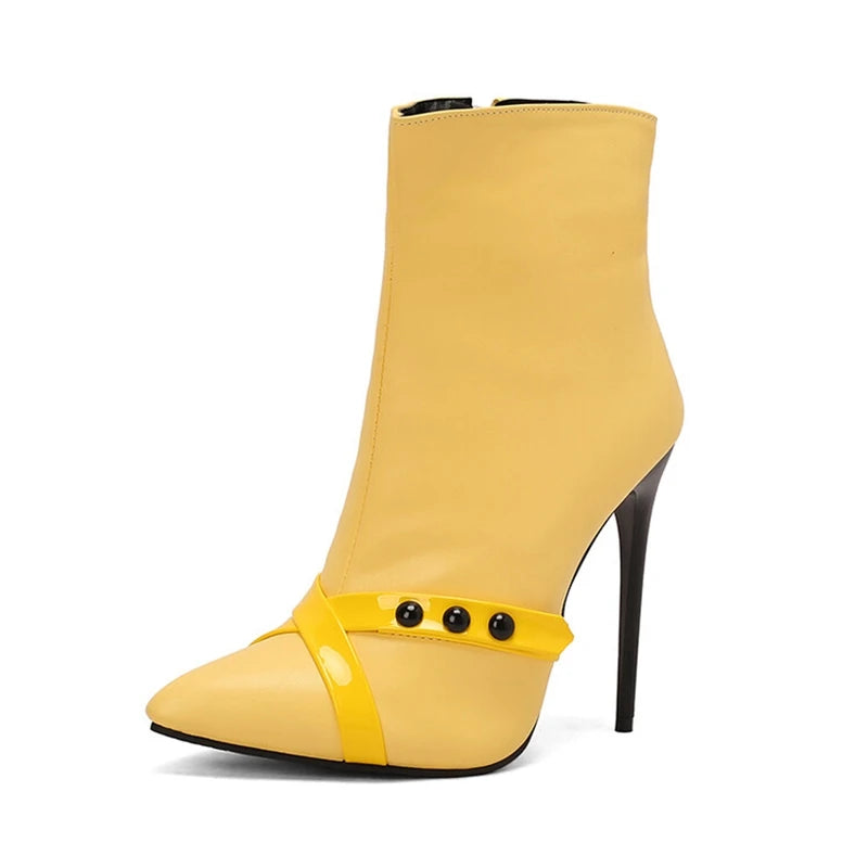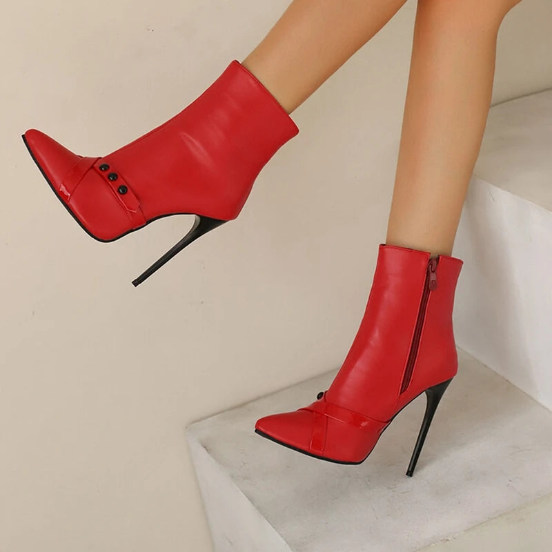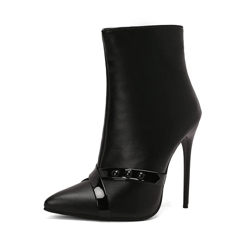Get ready to cause a scene. These Chain Reaction Stiletto Ankle Boots are here to serve boss energy, bold sass, and unapologetic style. With a sleek faux leather finish, razor-sharp pointed toe, and fierce chain accent across the vamp, these boots were made for queens who don't walk—they command the room.