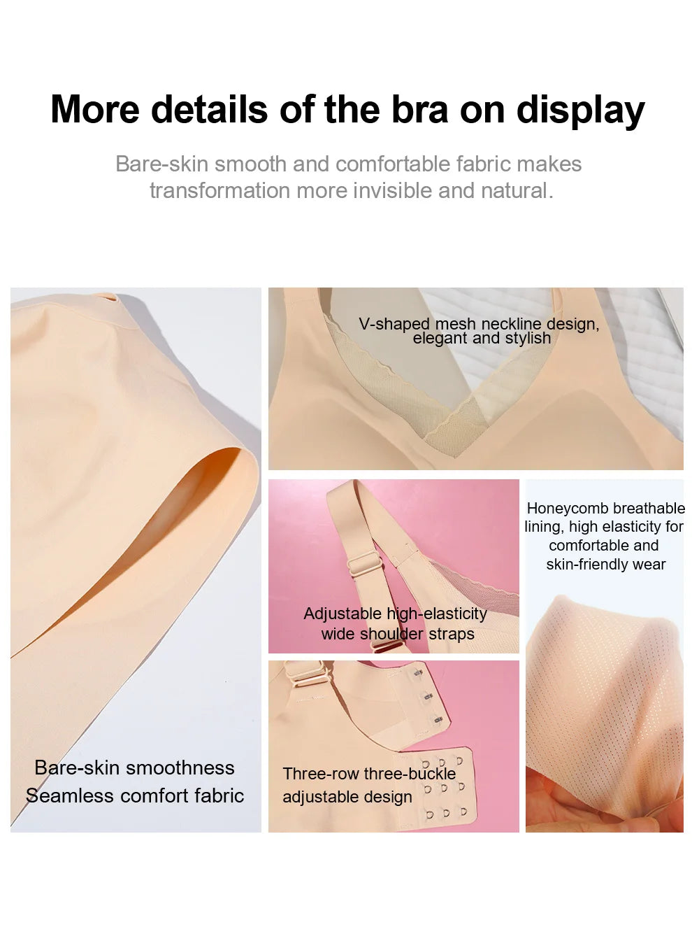 • Supportive Bra Design: Wireless, seamless bra with adjustable straps and hook closure for comfort and lift—A to E cup enhancements.