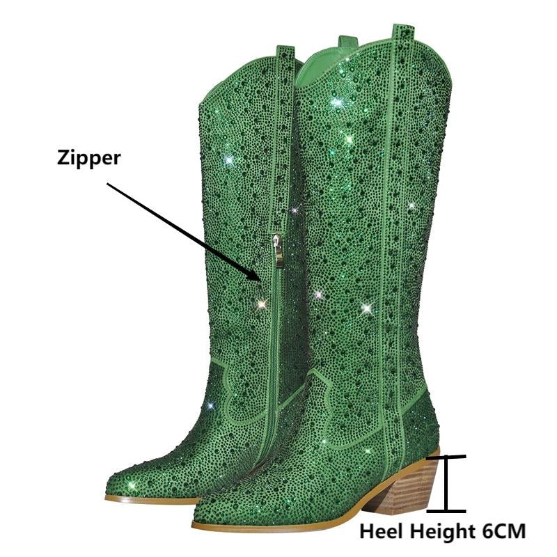 Darling, you're looking at the most fabulous boots this side of the Mississippi! These Rhinestone Green Knee-High Cowboy Boots are gonna have you feeling like the belle of the rodeo, with their sparkling sequined cloth upper and glittery clear bling.