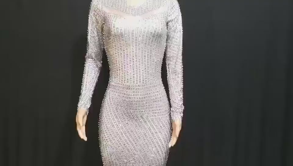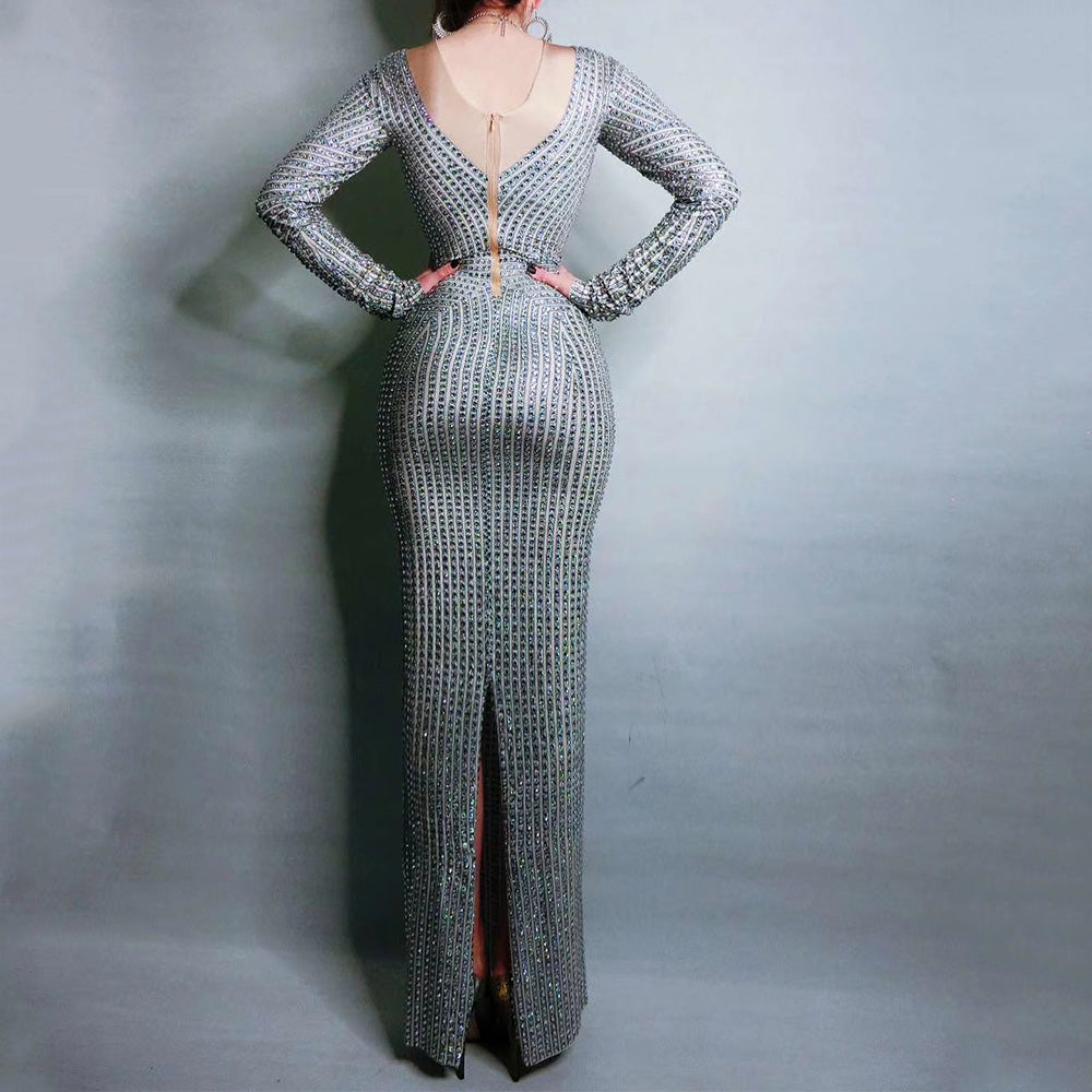 This baby comes in size S-L, so there's no excuse not to rock this look. And let's talk about that long sleeve glistening silver rhinestone fabric - you'll be shining brighter than the disco ball at the club. And with that long ankle-length dress and back slit, you'll be serving up some serious drama with every step you take.