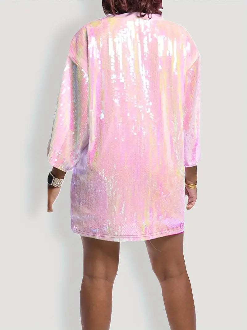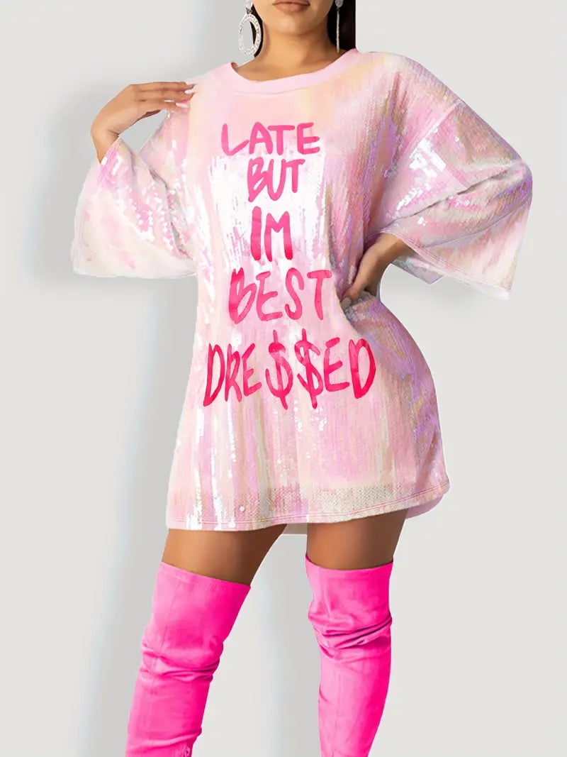 This sparkling pink sequined mini dress is the perfect way to make a statement and show everyone that you're not just late, you're fashionably late. The bold "Late But I'm Best Dressed" message across the front leaves no room for doubt that you're the star of the show.
