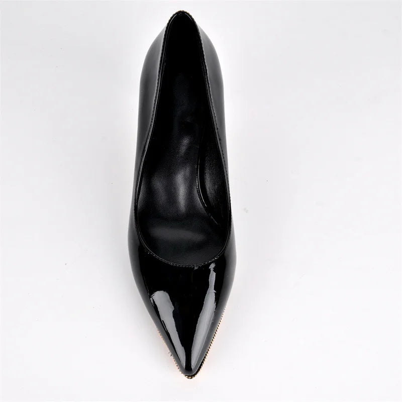 Step into timeless sophistication with these sleek pointed toe pumps. Featuring glossy patent leather, a 6.5cm stiletto heel, and effortless slip-on design, these pumps deliver polished elegance that works from stage to street.